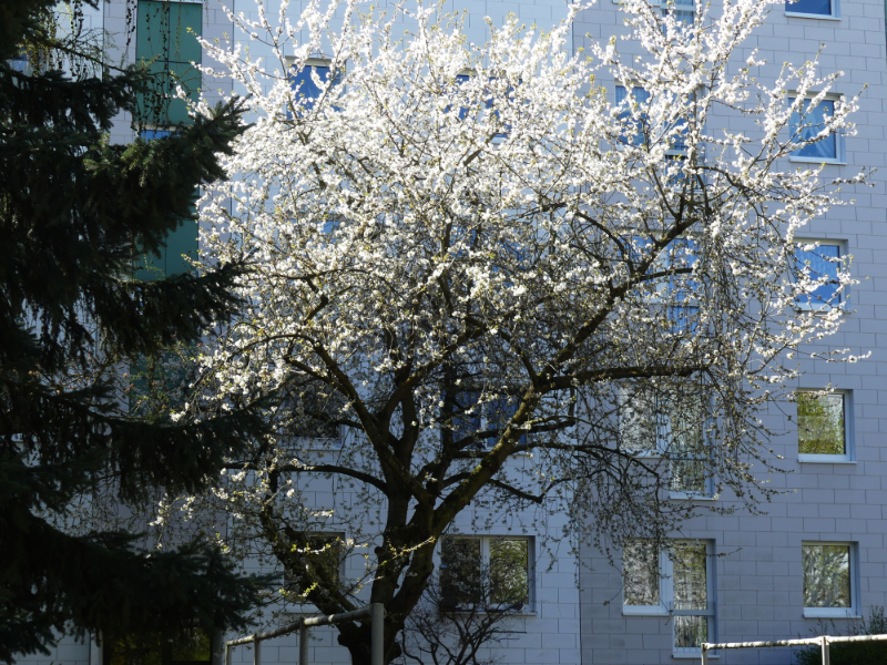 Vor meinem Fenster blüht gerade der Kirschbaum. Und so habe ich meinen Arbeitsplatz an das entsprechende Fenster verlegt. Ich mache mich jetzt mal wieder an meine Kommas, Leerzeichen, I-Punkte und so und freue mich über die schönen weißen Kirschblüten in der Dämmerung.